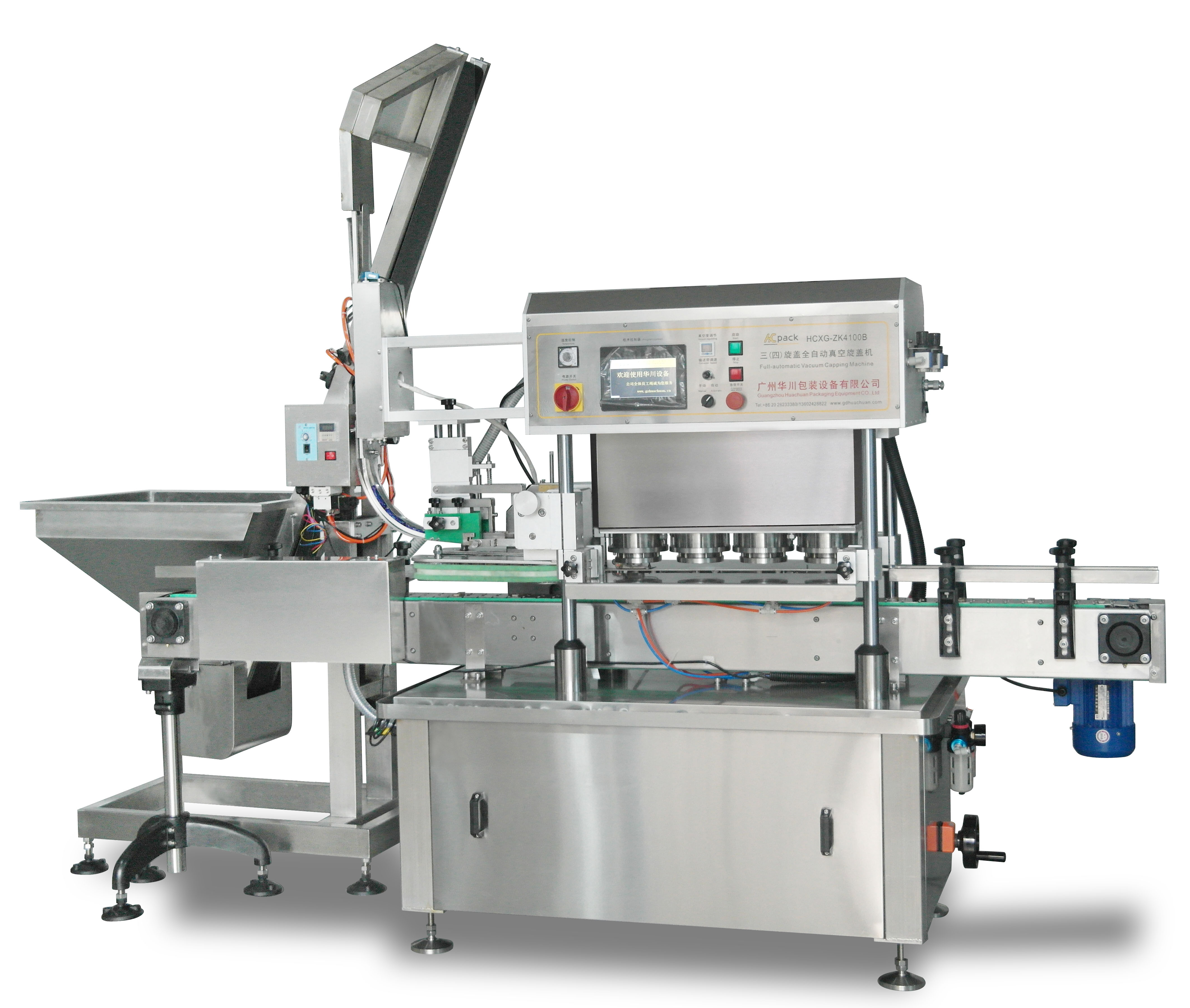 HCXG-ZK4100B型三(四)旋蓋玻璃瓶全自動(dòng)真空旋蓋機(jī)是用氣囊密封真空室技術(shù),真空泵直接抽真空方式。真空度即時(shí)可調(diào),不受物料溫度影響,抽真空效果好,提高產(chǎn)品保質(zhì)期。只需把容器放在輸送機(jī)上,容器通過分瓶機(jī)構(gòu)自動(dòng)輸送到旋蓋工位實(shí)現(xiàn)自動(dòng)抱瓶密封,抽真空旋蓋功能。(液體充填后,旋蓋封口前將瓶內(nèi)空氣抽空,以增加產(chǎn)品的保質(zhì)期及產(chǎn)品的保鮮性)